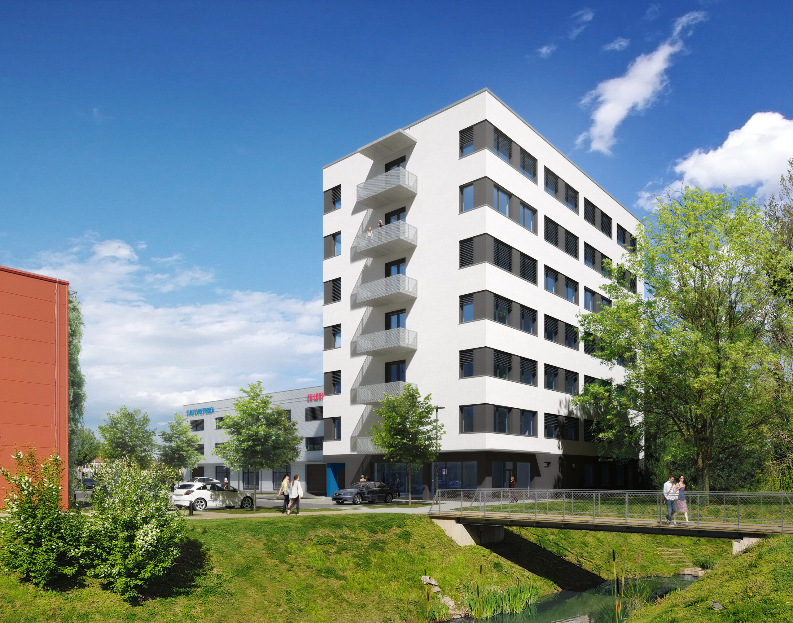 Současné prostory pro podnikání a inovace v kancelářích a flexiboxech jako součásti areálu Svatopetrská na nábřeží Ponávky v Brně-Komárově. Energeticky téměř nulová budova díky teplu a chladu z geotermálních vrtů, střechám s fotovoltaikou, důsledné rekuperaci a samozřejmě kvalitní obálce