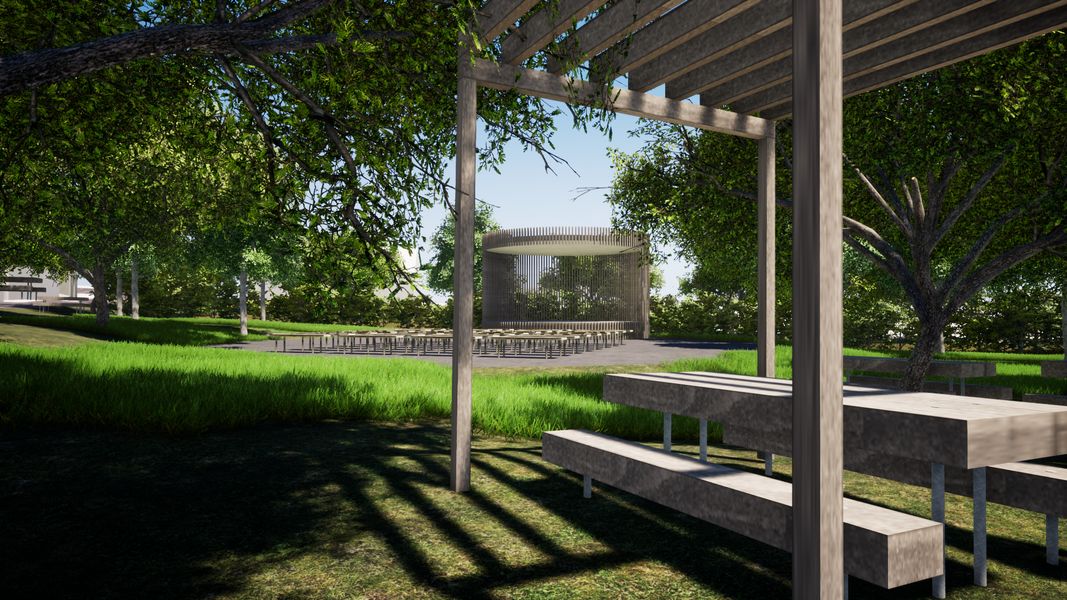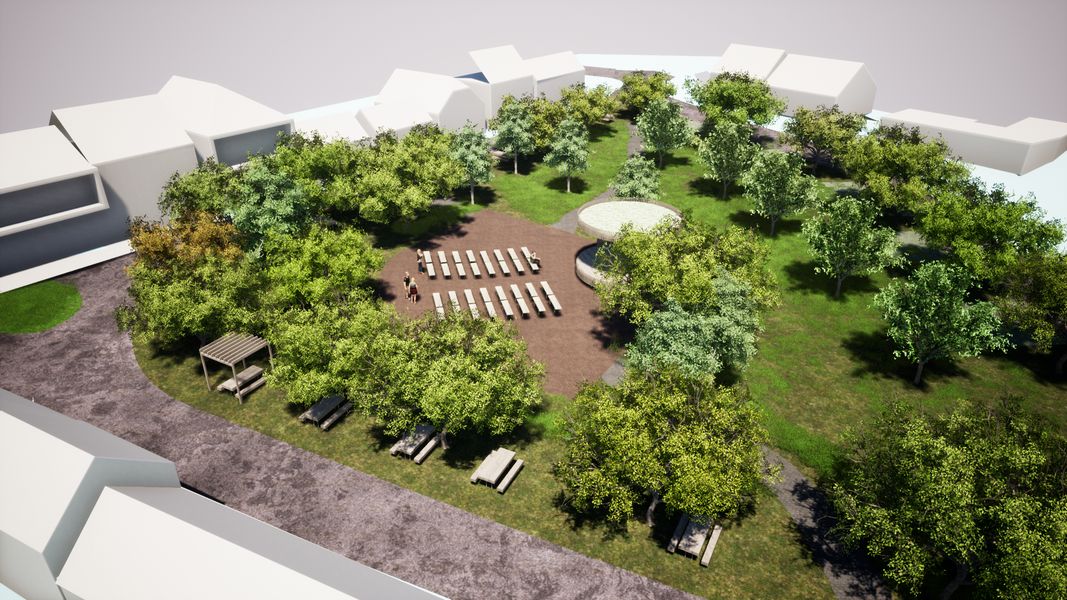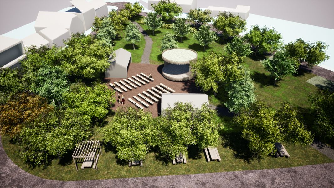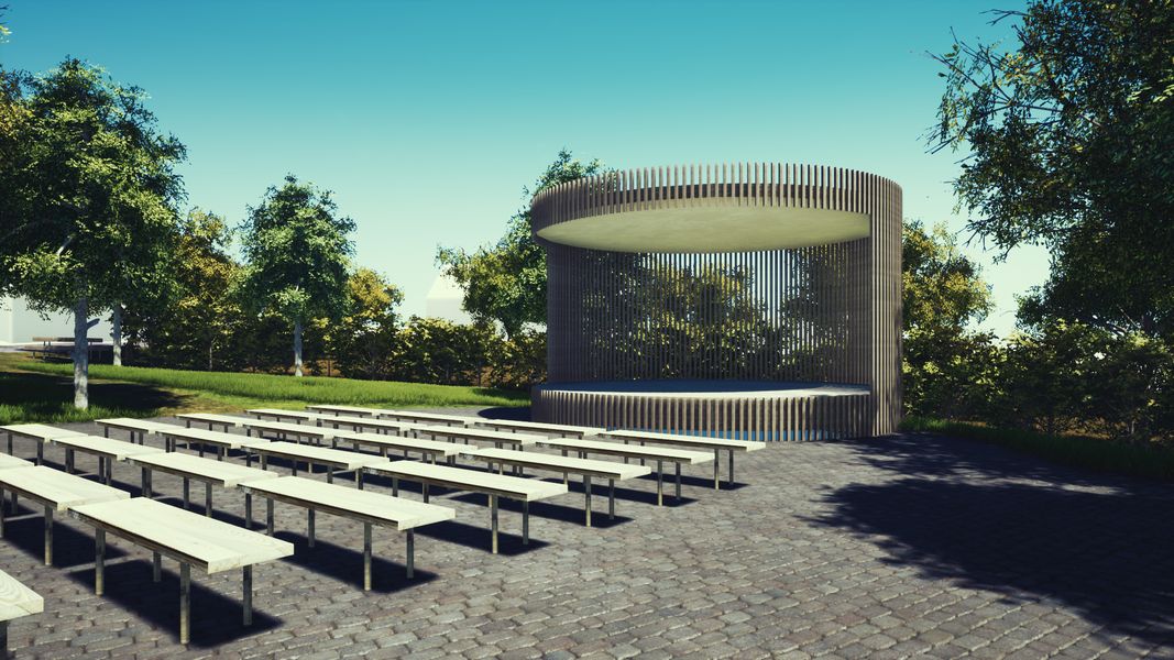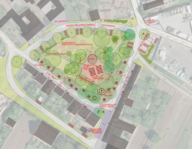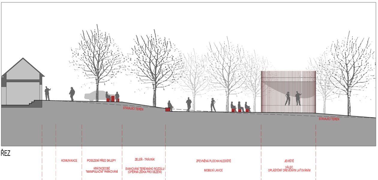 • Na přání obce jsme navrhli místo setkávání mezi sklepy. Místní vinaři a jejich návštěvy posedí přímo před sklepy pod korunami stromů. Vinobraní a další události oslaví větší společnost uprostřed parkové plochy, kde je navržené jeviště s hledištěm.